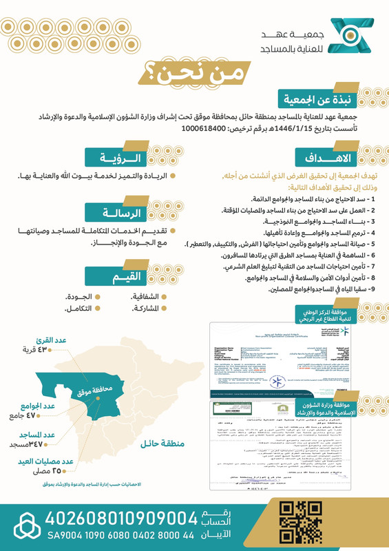 جمعية عهد للعناية بالمساجد بمنطقة حائل بمحافظة موقق تحت إشراف وزارة الشؤون الإسلامية والدعوة والإرشاد تأسست بتاريخ 15/1/1446هـ برقم ترخيص 1000618400